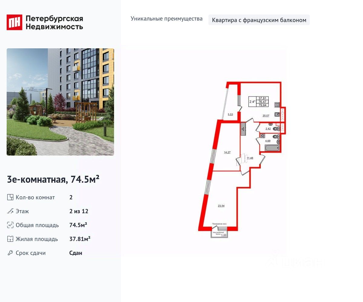 Уникальная, функциональная европланировка, большая кухня-гостиная 20.07 м², просторная прихожая 11.48 м². Общая площадь квартиры - 74.5 м², жилая 37.81 м², высота потолка 2.77 м.