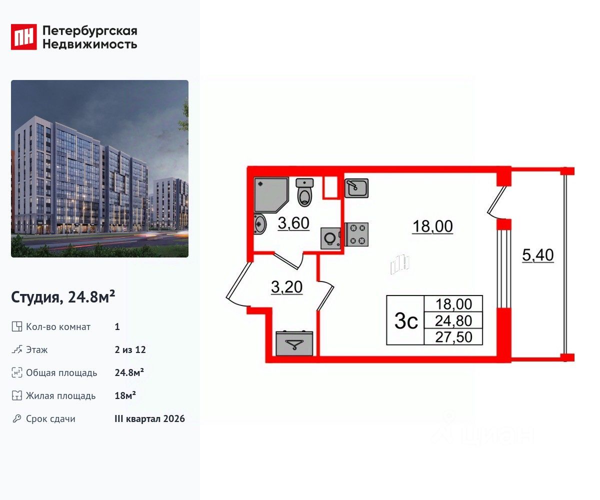 Удобная, классическая, функциональная европланировка, вместительная прихожая 3.2 м². Общая площадь студии - 24.8 м², жилая 18 м², высота потолка 2.77 м.