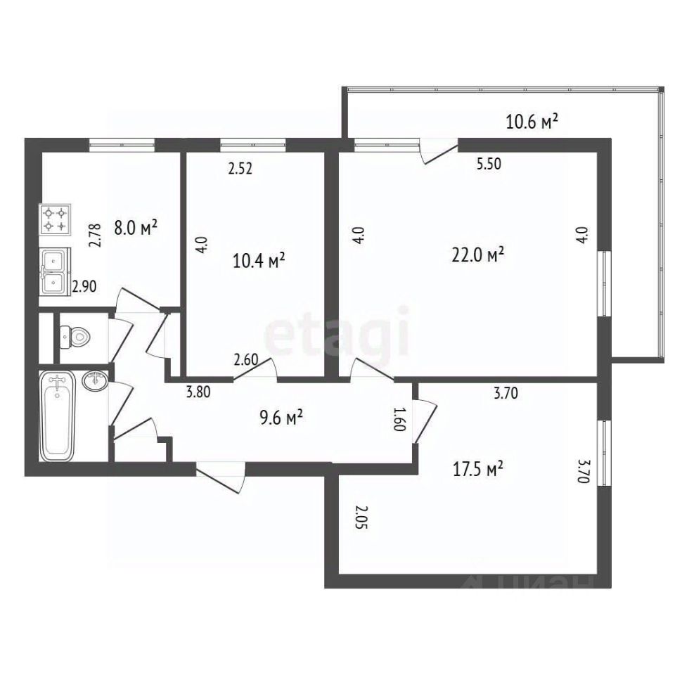 - планировка раздельная: три комнаты площадью 10.4, 17.5 и 22.0 кв.м, просторный коридор 9.6 кв.м со встроенными шкафами, совмещенный санузел с гигиеническим душем и большой балкон протяженностью 11 метров по периметру квартиры. В комнате 17.5 кв.