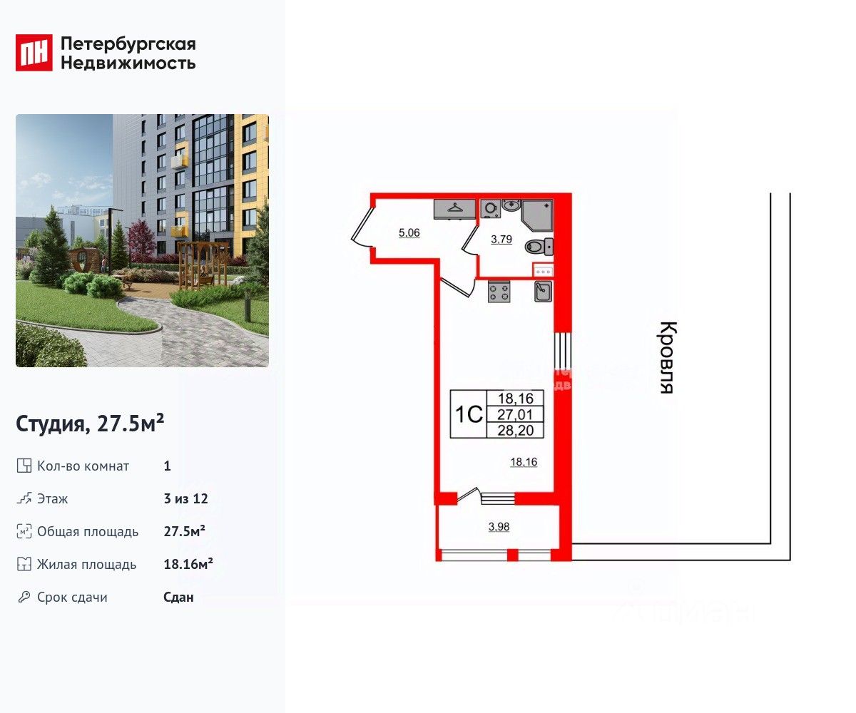 Удобная, классическая, функциональная европланировка, просторная прихожая 5.06 м². Общая площадь студии - 27.5 м², жилая 18.16 м², высота потолка 2.77 м.