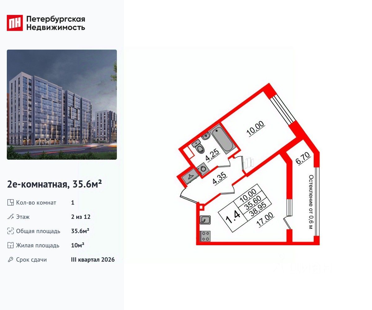 Удобная, классическая, функциональная европланировка, большая кухня-гостиная 17 м², просторная прихожая 4.35 м². Общая площадь квартиры - 35.6 м², жилая 10 м², высота потолка 2.77 м.