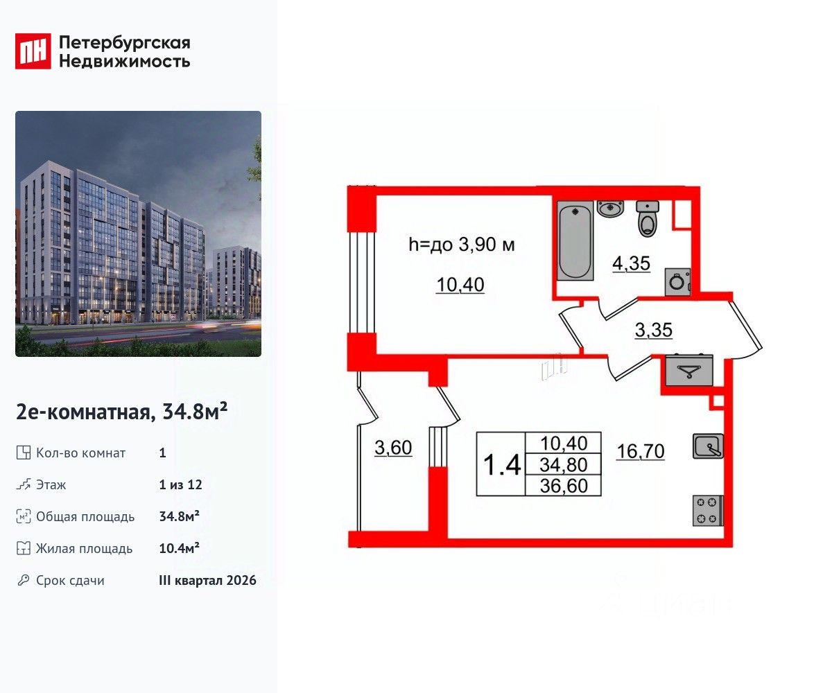 Удобная, классическая, функциональная европланировка, большая кухня-гостиная 16.7 м², вместительная прихожая 3.35 м². Общая площадь квартиры - 34.8 м², жилая 10.4 м², высота потолка 3.97 м.