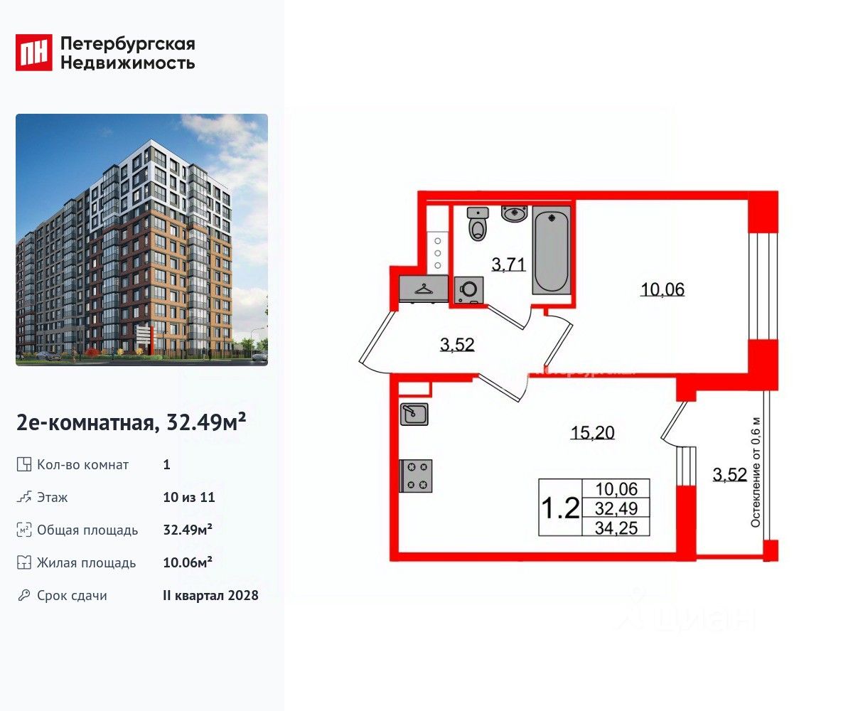 Удобная, классическая, функциональная европланировка, большая кухня-гостиная 15.2 м², вместительная прихожая 3.52 м². Общая площадь квартиры - 32.49 м², жилая 10.06 м², высота потолка 2.77 м.
