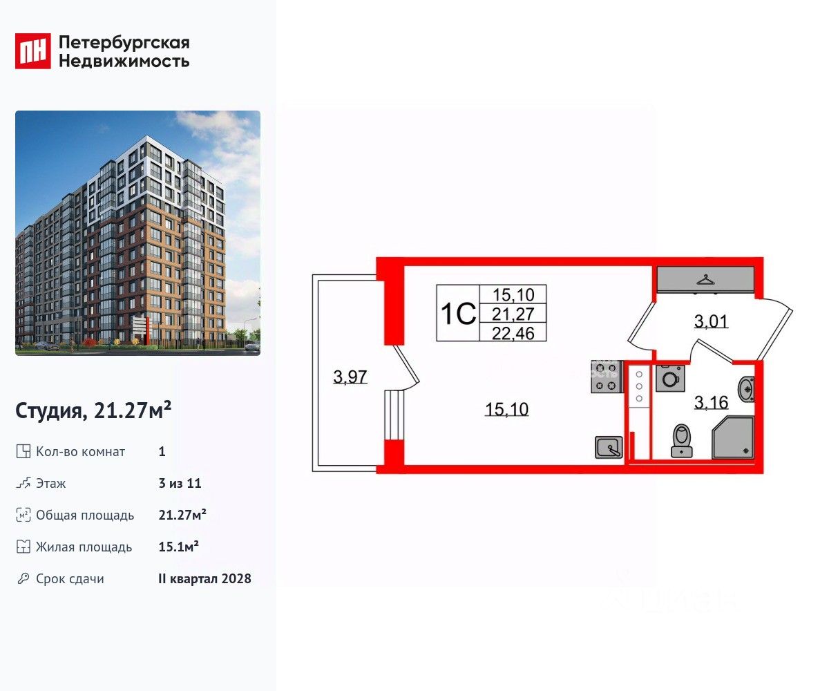 Удобная, классическая, функциональная европланировка, вместительная прихожая 3.01 м². Общая площадь студии - 21.27 м², жилая 15.1 м², высота потолка 2.77 м.
