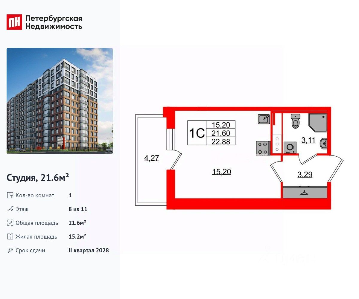 Удобная, классическая, функциональная европланировка, просторная прихожая 3.29 м². Общая площадь студии - 21.6 м², жилая 15.2 м², высота потолка 2.77 м.
