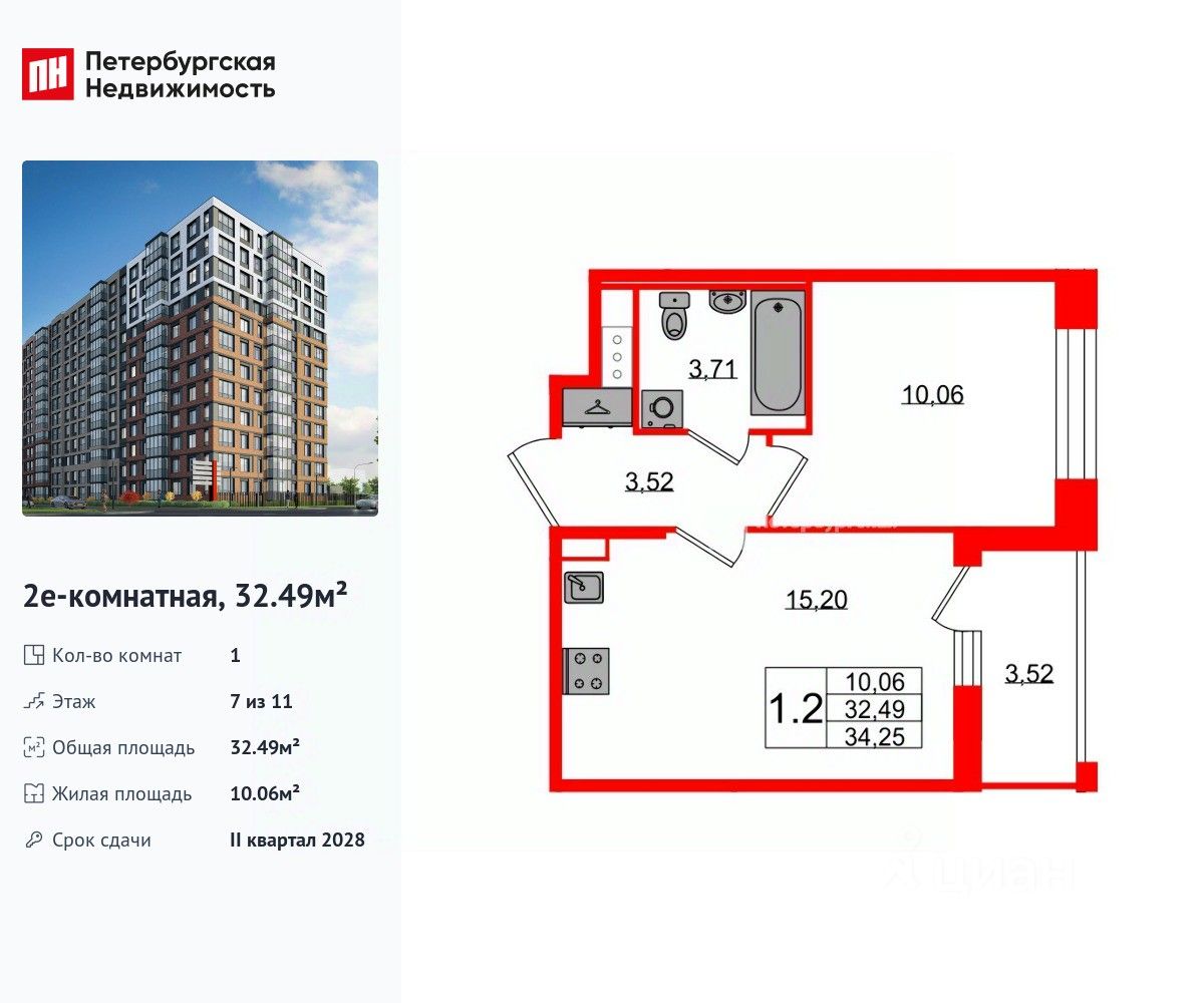 Удобная, классическая, функциональная европланировка, большая кухня-гостиная 15.2 м², вместительная прихожая 3.52 м². Общая площадь квартиры - 32.49 м², жилая 10.06 м², высота потолка 2.77 м.