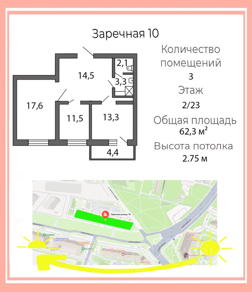 Арт. 129487659 В продаже офис 62,3 м² у метро Парнас заезжай и работай! В 10 мин пешком от метро Парнас, по адресу: Заречная ул., д. 10, предлагается в продажу нежилое помещение площадью 62,3 кв м. Свободного назначения. Помещение располагается на 2-м этаже 23-х этажного кирпично-монолитного дома 2018 года постройки.