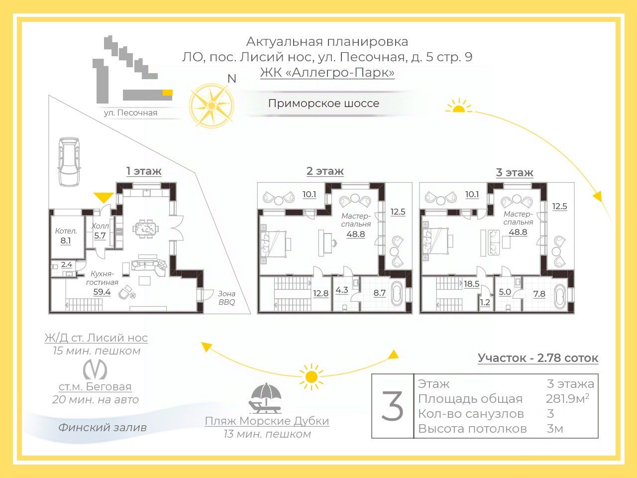 Арт. 129259844 Таунхаус в ''Аллегро Парк'', Лисий Нос Премиальный формат загородной жизни в 20 минутах от центра Петербурга! ''Аллегро Парк'' — камерный клубный комплекс всего на 33 резиденции, в окружении леса и воздуха. Это закрытая охраняемая территория с единой архитектурной концепцией в стиле альпийского шале и тщательно продуманным благоустройством. Все коммуникации городские, подъезд по асфальтированным дорогам, рядом остановки общественного транспорта и ж/д станция. В 515 минутах — природные тропы, пляжи, прогулочные маршруты и благоустроенный берег. Транспортная доступность: до Приморского шоссе, КАД и ЗСД — около 3 км, до центра СанктПетербурга — порядка 20 минут на машине, до метро ''Беговая'', ''Старая Деревня'', ''Чёрная речка'' ходит прямой общественный транспорт, остановка в 5 минутах пешком, ж/д станция Лисий Нос также находится в шаговой доступности. В самом посёлке Лисий Нос есть всё необходимое для постоянной жизни: школы, детские сады, магазины и сервисы. Таунхаус построен по современной технологии: монолитный железобетонный каркас, надёжный фундамент, качественные перекрытия. Наружные стены выполнены из клеёного бруса (Финляндия) или газобетонного блока с навесными вентилируемыми фасадами, что обеспечивает стабильный микроклимат и энергоэффективность. В доме предусмотрен тёплый пол, продуманная вентиляция и дымоходы, современные инженерные системы европейских производителей. У таунхауса есть собственный земельный участок площадью 2,78 соток. На территории комплекса обустроены: детская площадка, прогулочные дорожки и озеленение, парковочные места у каждого дома, часто с навесом для автомобиля. Закрытый въезд, охрана и видеонаблюдение обеспечивают спокойствие и безопасность жителей. Таунхаус в ''Аллегро Парк'' — идеальное решение для: семей, которые устали от плотной городской застройки, но не готовы жертвовать инфраструктурой и временем на дорогу, тех, кто ценит природу, тишину и прогулки у воды, но хочет жить в пределах города с городской пропиской, предпринимателей и специалистов, которым важно сочетание статуса, качества строительства и приватности. Это формат, где вы получаете пространство загородного дома, безопасность и сервис клубного комплекса и при этом остаётесь в комфортной транспортной связке с центром Петербурга. Звоните, с удовольствеием отвечу на оставшиеся вопросы и организую просмотр таунхауса!