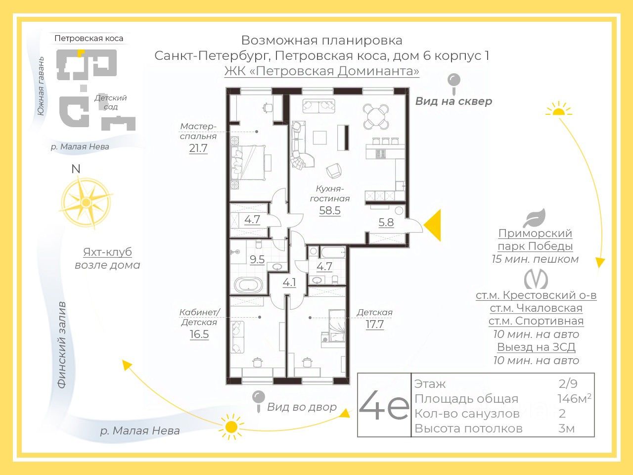Общая площадь квартиры 146 м2, Гостиная и кухня 59,5 м2, Обособленная мастер-зона хозяев (спальня, гардеробная и санузел) 41 м2, Детская комната с окнами в тихий двор 17,7 м2, Детская или кабинет с окнами в тихий двор 16,5 м2, Гостевой санузел 4,7 м2.