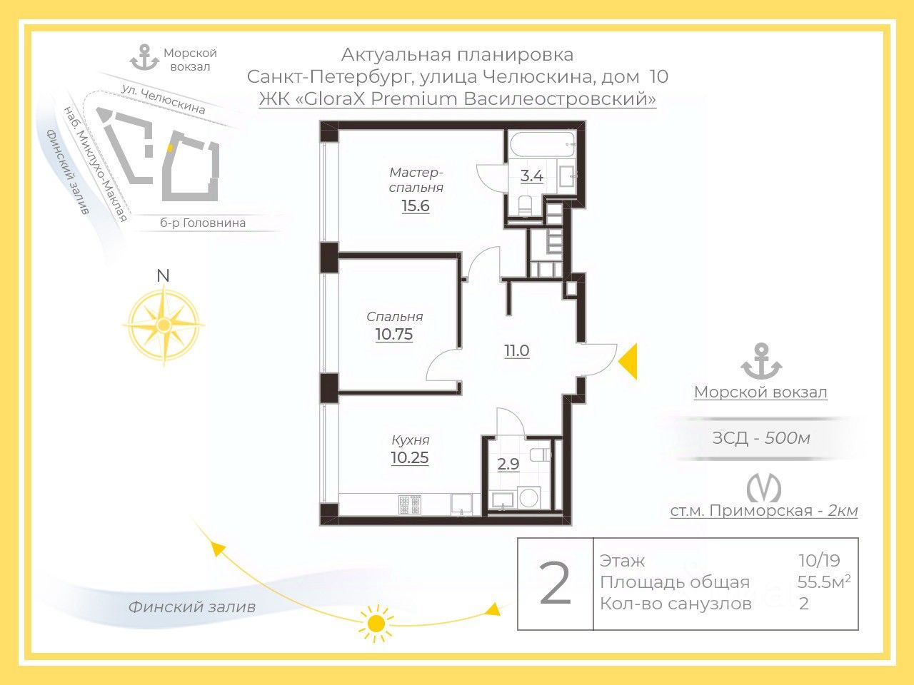 О квартире Площадь: 55 м² Этаж: 10/19 Планировка: 2 комнатная Окна: на улицу, боковой вид на воду Потолки: 3 Состояние: white box. Свобода дизайна: выбираете стиль, материалы и планировочные решения под себя, без переплаты за чужую отделку.