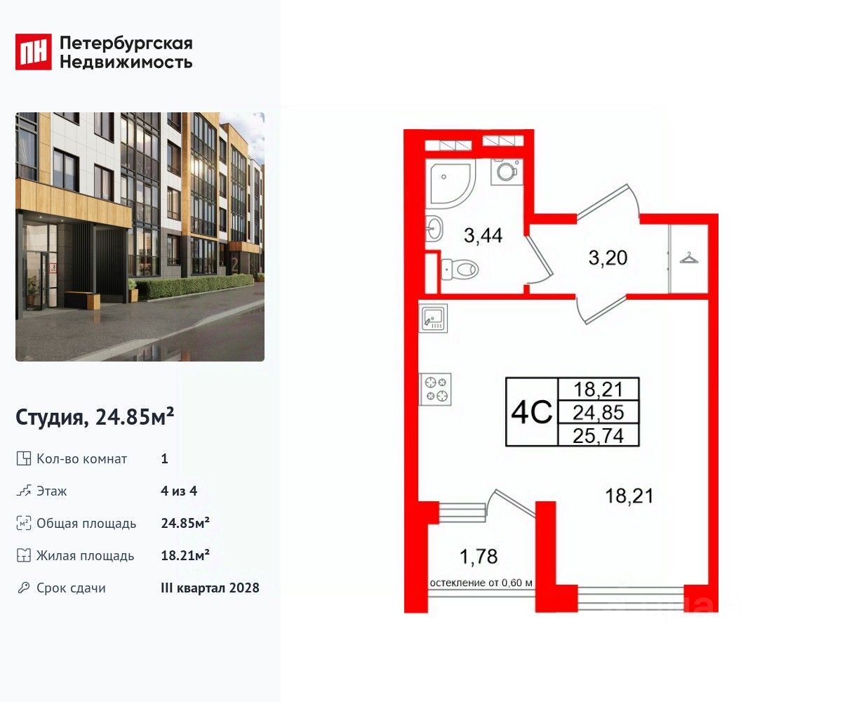 Удобная, классическая, функциональная европланировка, вместительная прихожая 3.2 м². Общая площадь студии - 24.85 м², жилая 18.21 м², высота потолка 3.07 м.