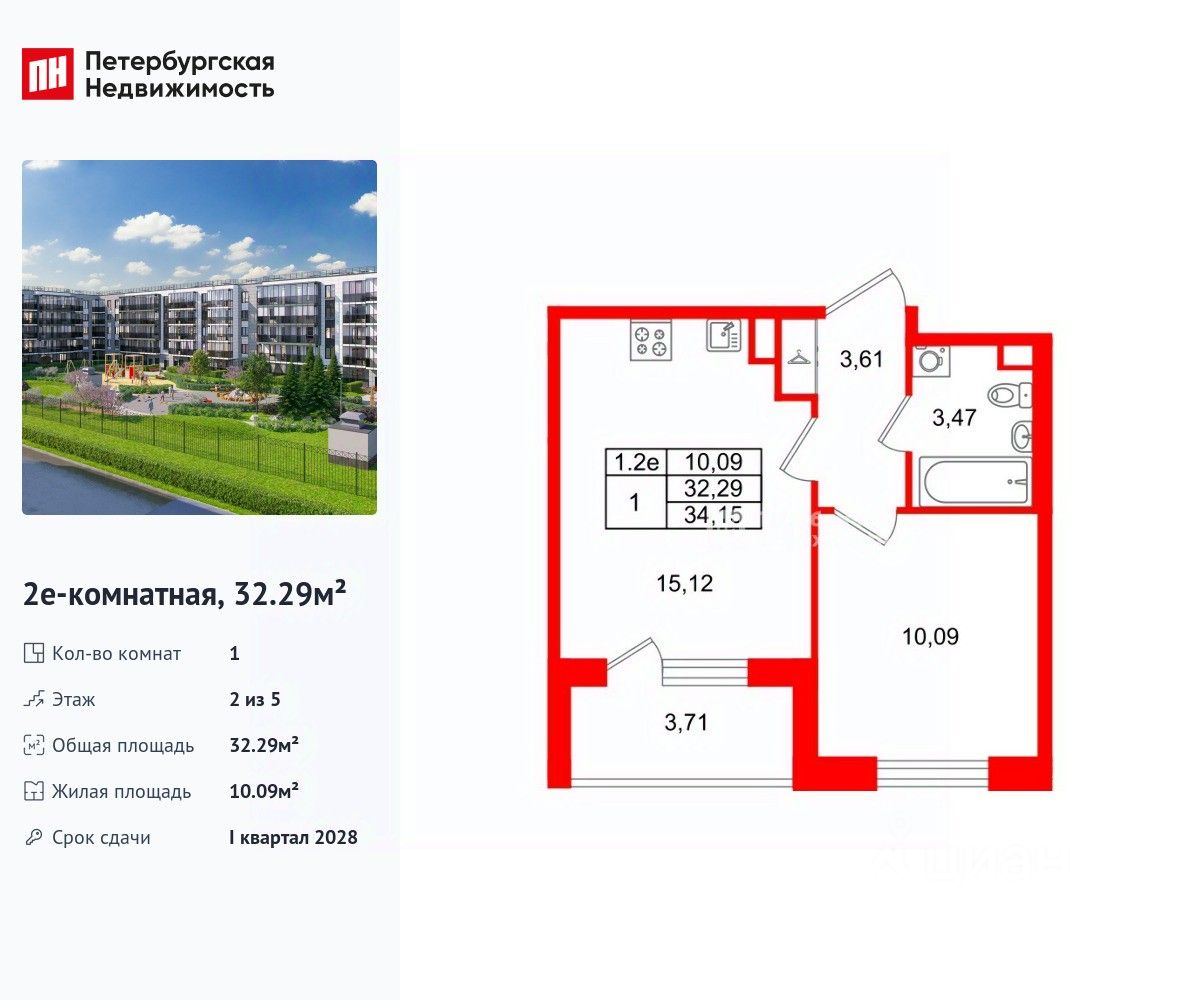 Удобная, классическая, функциональная европланировка, большая кухня-гостиная 15.12 м², вместительная прихожая 3.61 м². Общая площадь квартиры - 32.29 м², жилая 10.09 м², высота потолка 2.77 м.