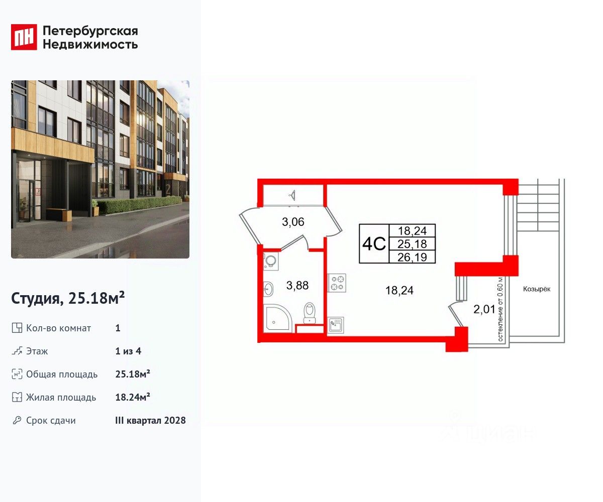 Удобная, классическая, функциональная европланировка, вместительная прихожая 3.06 м². Общая площадь студии - 25.18 м², жилая 18.24 м², высота потолка 2.77 м.