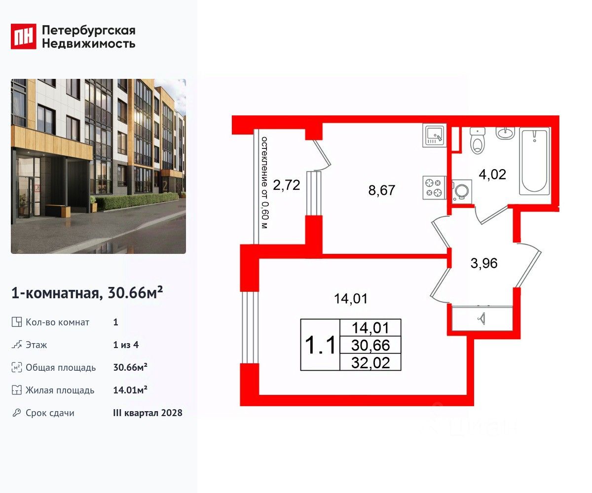Удобная, классическая планировка, кухня 8.67 м², вместительная прихожая 3.96 м². Общая площадь квартиры - 30.66 м², жилая 14.01 м², высота потолка 2.77 м.