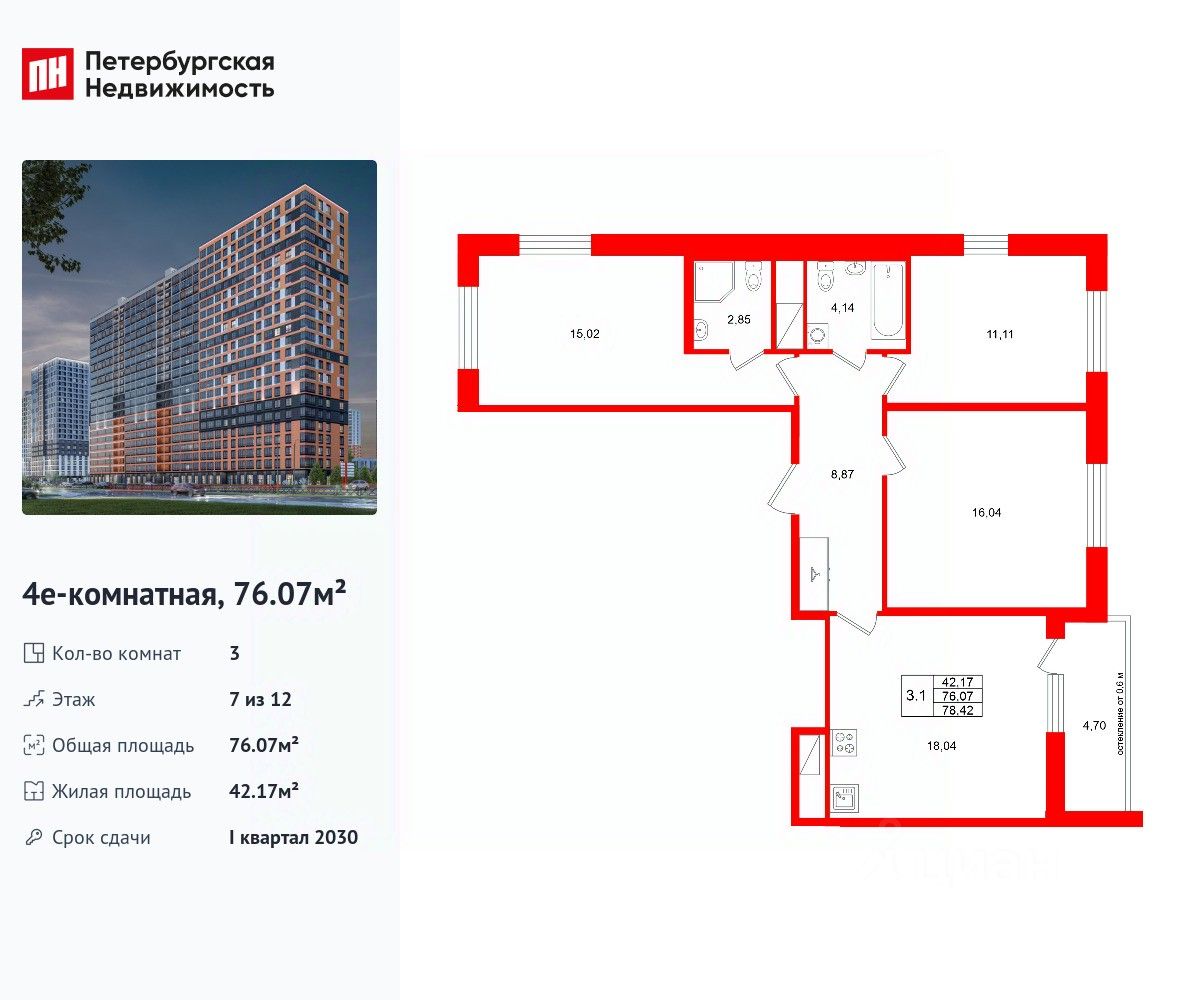 Удобная, классическая, функциональная европланировка, большая кухня-гостиная 18.04 м², вместительная прихожая 8.87 м². Общая площадь квартиры - 76.07 м², жилая 42.17 м², высота потолка 2.77 м.