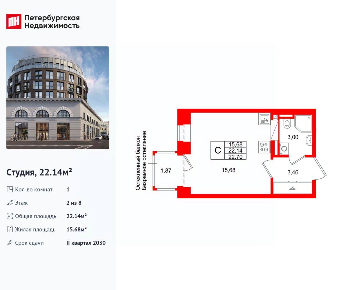 Удобная, классическая, функциональная европланировка, просторная прихожая 3.46 м². Общая площадь студии - 22.14 м², жилая 15.68 м², высота потолка 2.7 м.