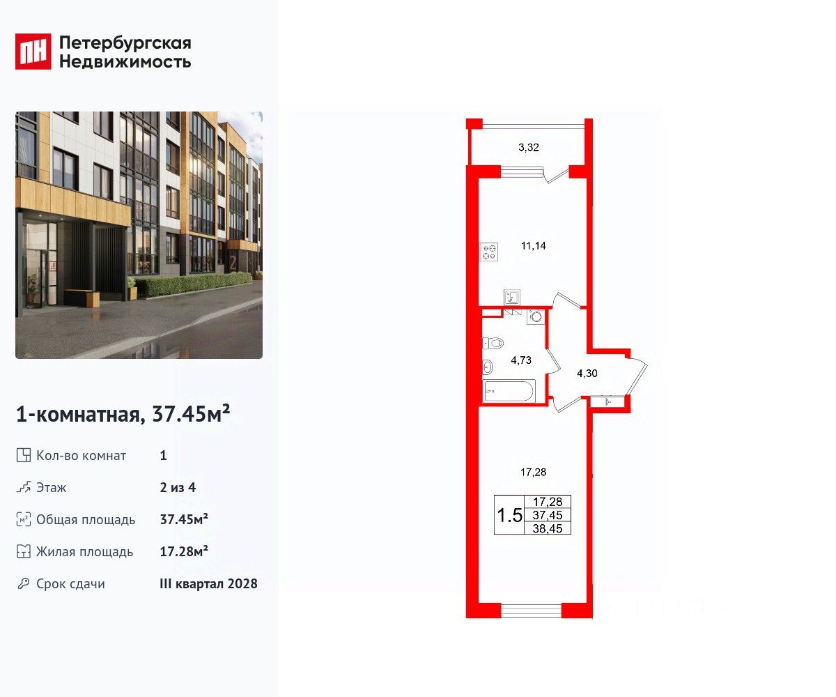 Общая площадь37,45 м2