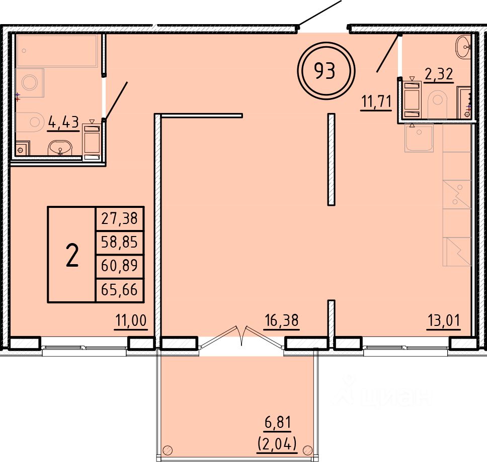 Общая площадь58,85 м2