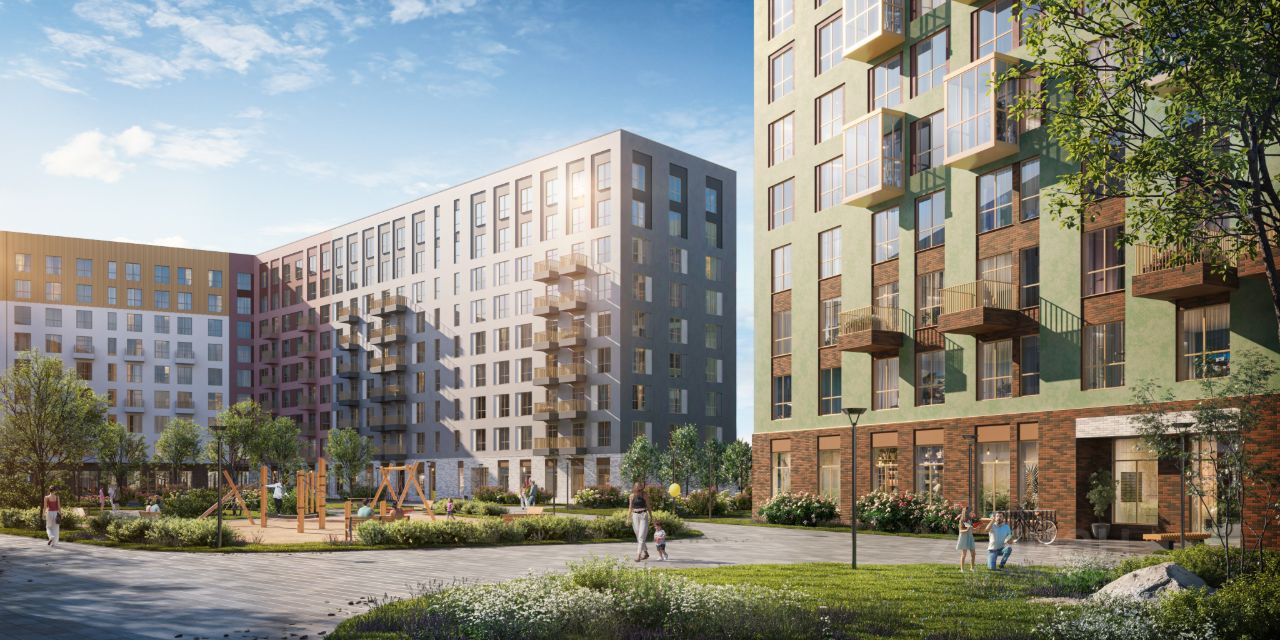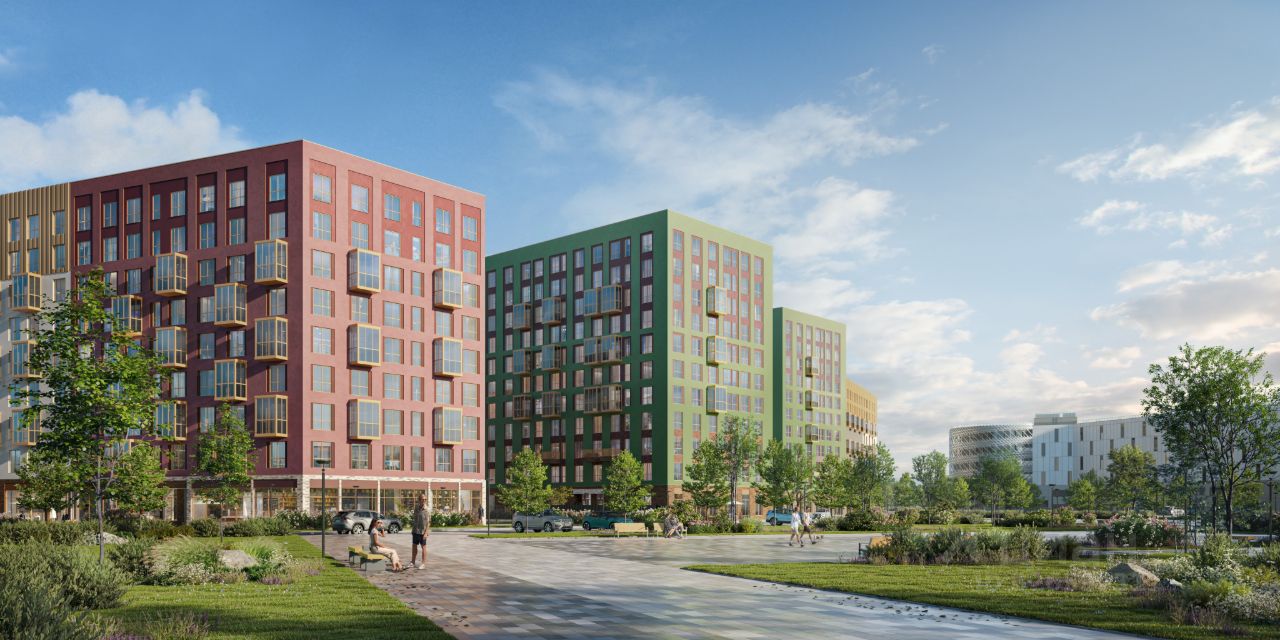 Дома высотой до 11 этажей с панорамными балконами выполнены в скандинавском стиле.
