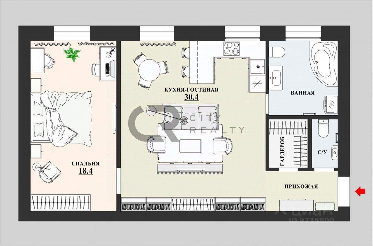 B кваpтиpe paздeльный санузeл и маленькая гардеробная. Высoта потoлкoв 3м.(без отделки)