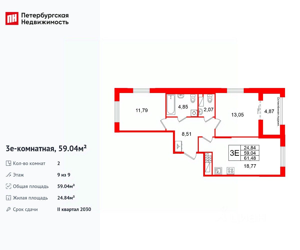 Удобная, классическая, функциональная европланировка, большая кухня-гостиная 18.77 м², просторная прихожая 8.51 м². Общая площадь квартиры - 59.04 м², жилая 24.84 м², высота потолка 3.2 м.