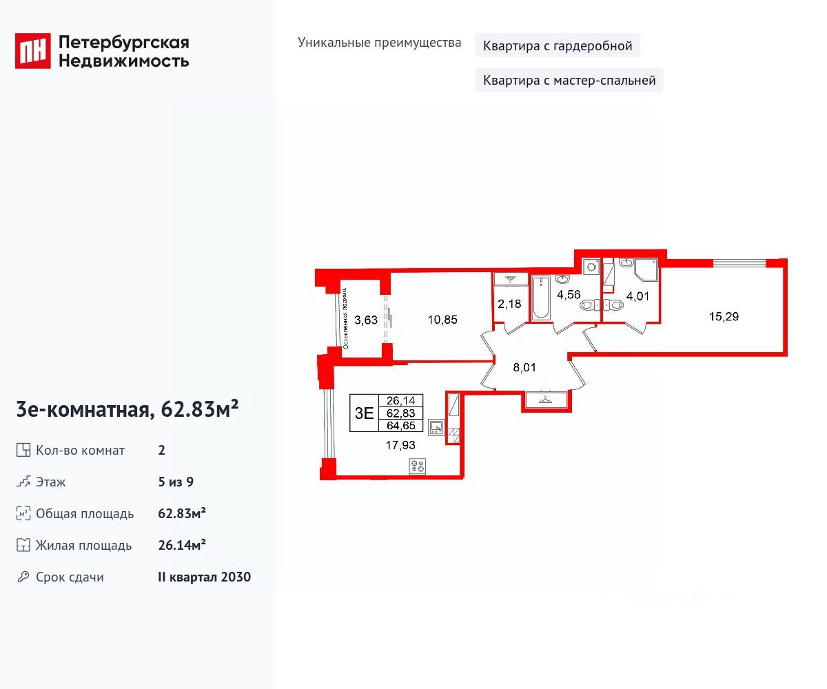 Уникальная, функциональная европланировка, большая кухня-гостиная 17.93 м², просторная прихожая 8.01 м². Общая площадь квартиры - 62.83 м², жилая 26.14 м², высота потолка 3 м.