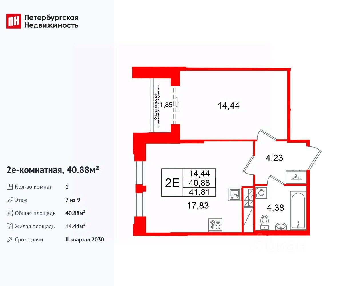 Удобная, классическая, функциональная европланировка, большая кухня-гостиная 17.83 м², просторная прихожая 4.23 м². Общая площадь квартиры - 40.88 м², жилая 14.44 м², высота потолка 3 м.