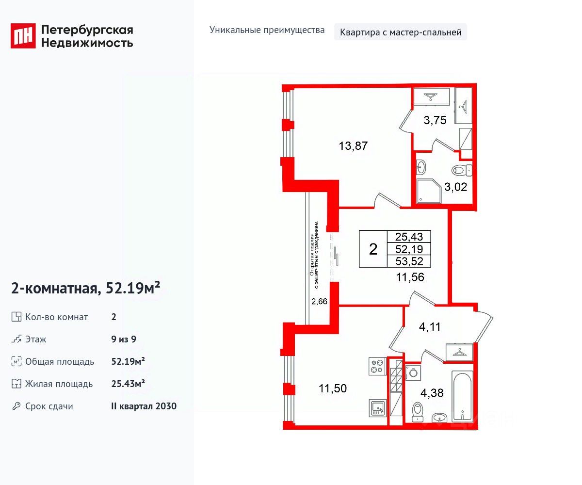 Уникальная планировка, кухня 11.5 м², вместительная прихожая 4.11 м². Общая площадь квартиры - 52.19 м², жилая 25.43 м², высота потолка 3.2 м.