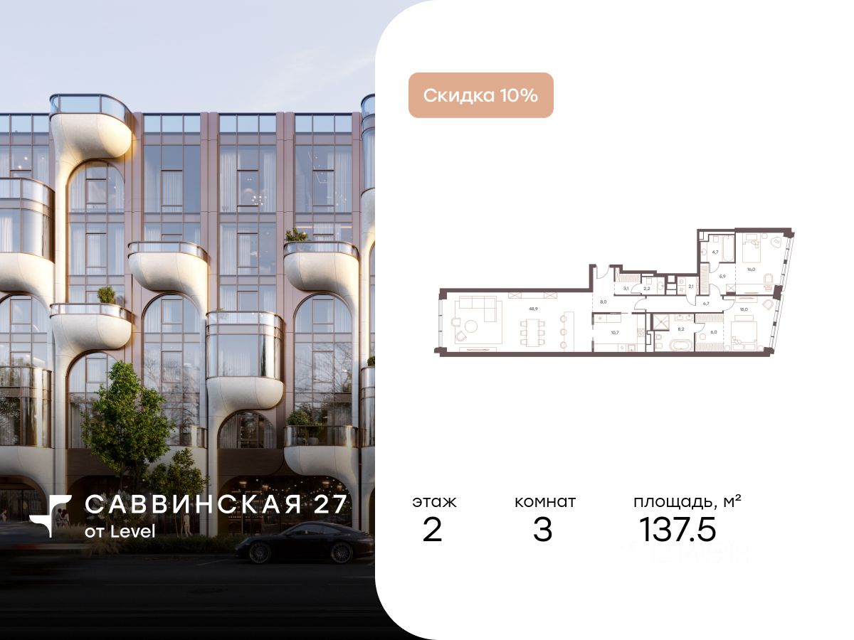 В историческом районе Хамовники продаются 3-к апартаменты площадью 137.50 кв.м, расположенные на 2 этаже делюкс-резиденции Саввинская 27 от Левел.