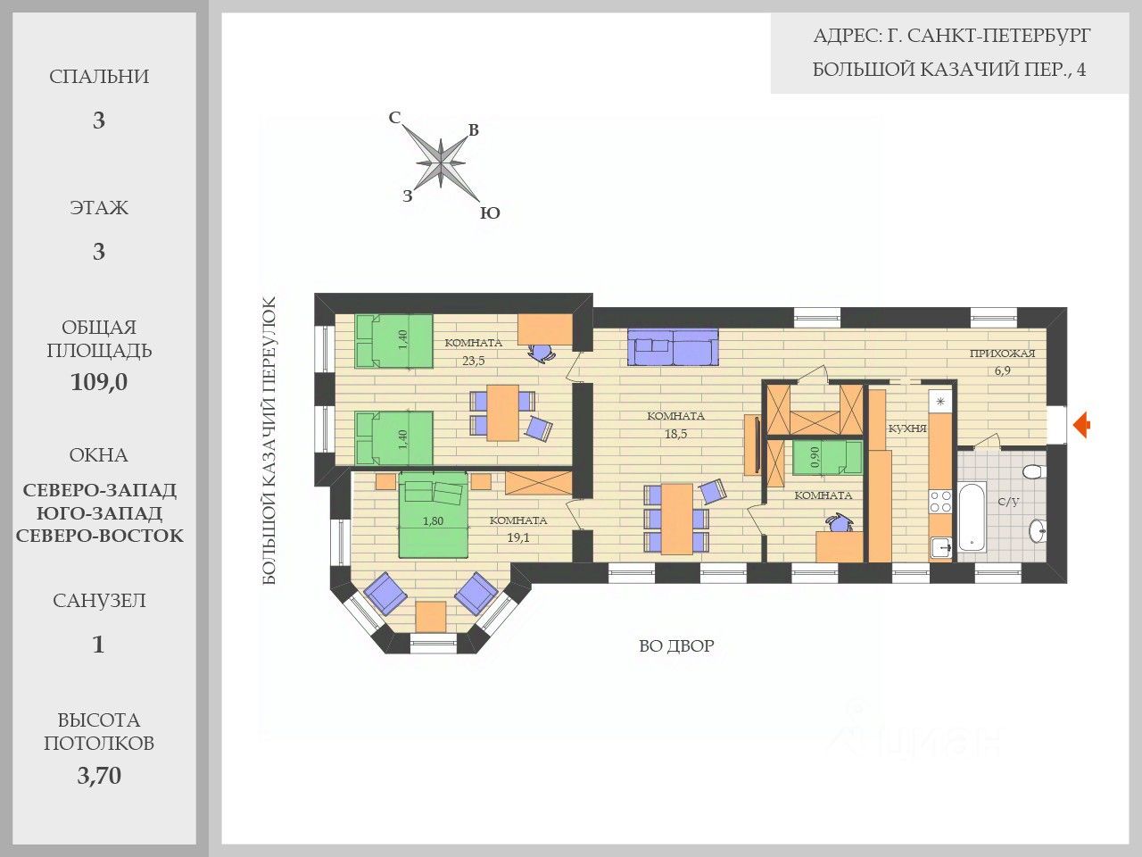 109м2/ 3 спальни/до 5 гостей