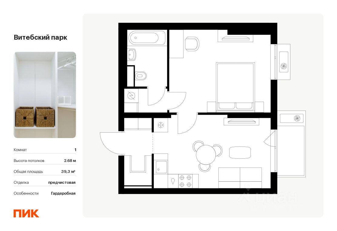Продаётся 1-комн. квартира площадью 39,3 кв.м на 7 этаже 12 этажного дома (Корпус 6, Секция 3) проекта ПИК Витебский парк. Светлый просторный подъезд на уровне земли, функциональная планировка, большие окна, c отделкой.