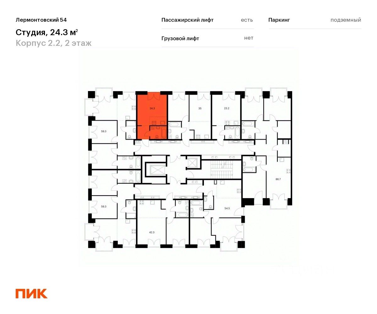 Продаётся квартира-студия площадью 24,3 кв.м на 2 этаже 7 этажного дома (Корпус 2.2, Секция 8) проекта ПИК Лермонтовский 54. Светлый просторный подъезд на уровне земли, функциональная планировка, большие окна, без отделки.