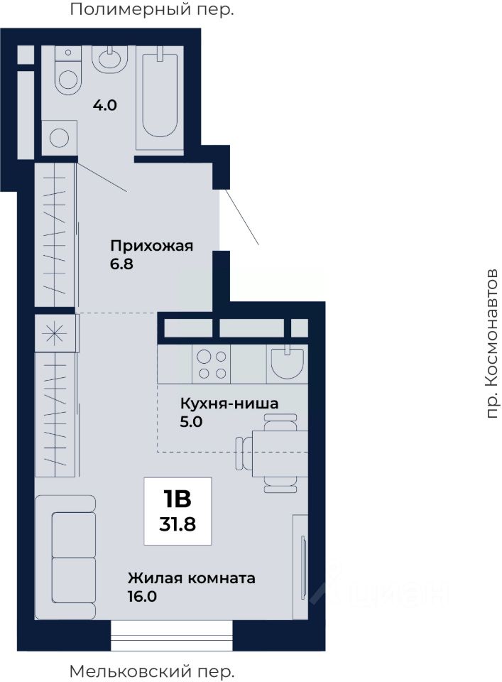 Продаётся студия в строящемся доме (Дом 8,9), срок сдачи: I-кв. 2029, общей площадью 31.8 кв.м., на 25 этаже. ЖК ''Космос'' - современный жилой квартал на проспекте Космонавтов 7, который строит ГК ''Ривьера Инвест Екатеринбург''. Жилой комплекс - это пять домов, благоустроенная территория комплекса и наземная парковка. Места общего пользования также выполнены в единой стилистике ''космической'' темы, используемой и в оформлении холлов, и дворов.