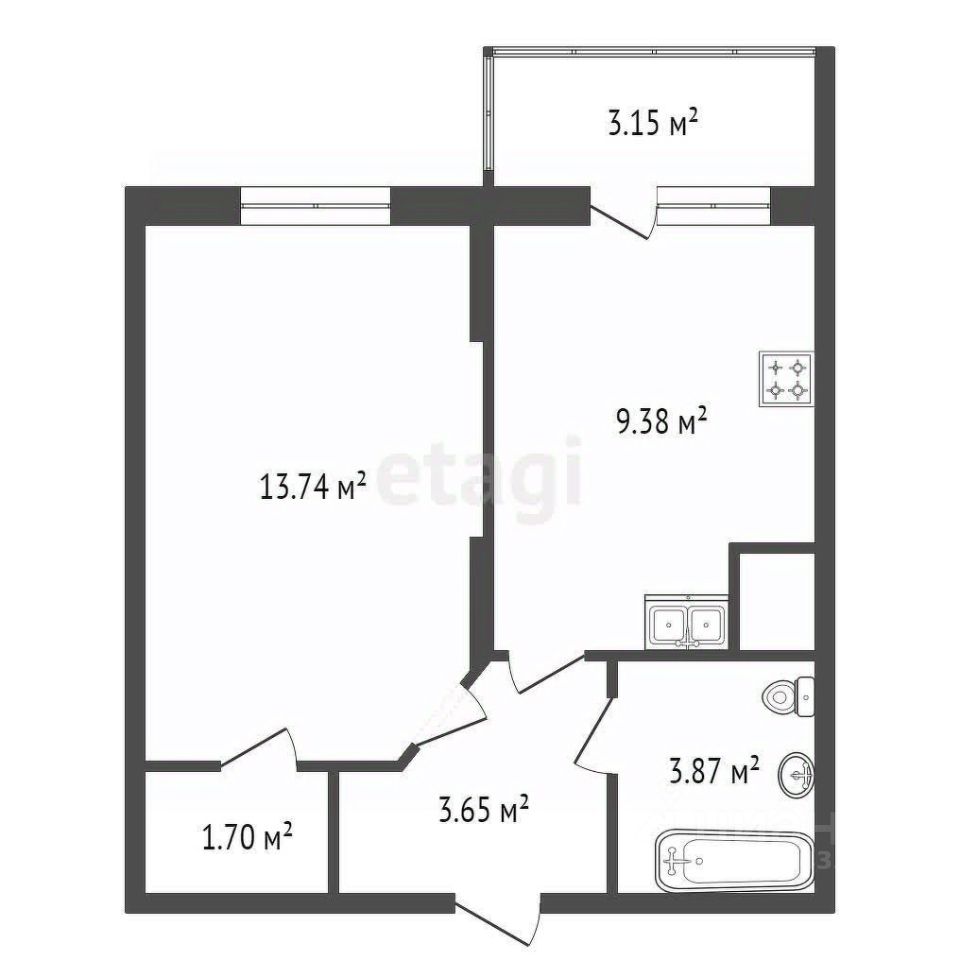 Объект отличается рациональной планировкой, где каждое помещение имеет значительную площадь: прихожая 3,65 м², кухня 9,38 м², спальня 13,74 м². Кухня оснащена встроенным гарнитуром с необходимой техникой и имеет выход на остекленную лоджию площадью 3,15 м², выходящую в тихий двор.