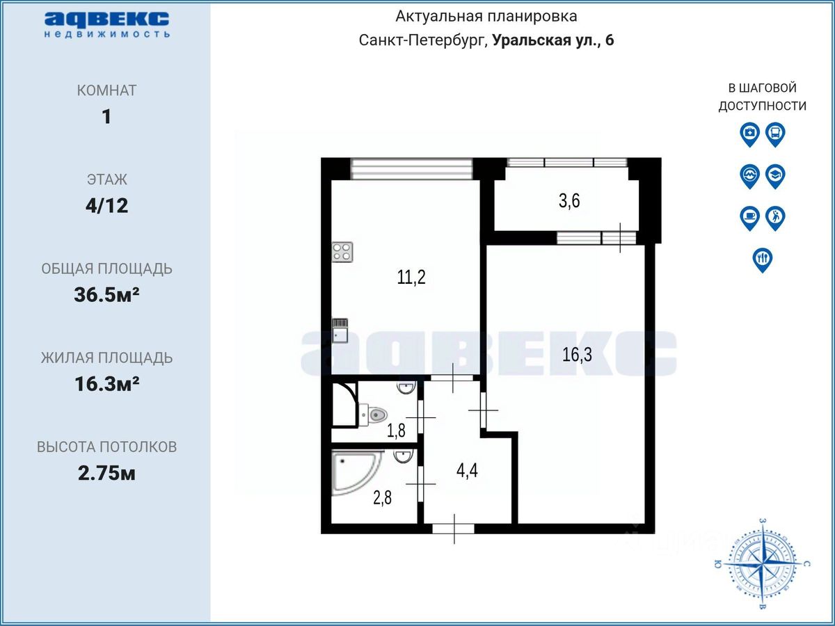 Общая площадь квартиры 36,5 кв. м., без учета лоджии. Удобная планировка: просторная комната 16,3 кв. м с выходом на лоджию, кухня 11,2 кв. м. , раздельный санузел. Высота потолков — 2,75 метра.