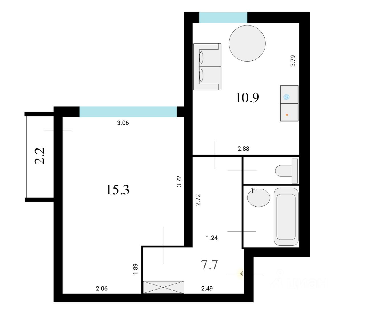 Общая площадь 39,2 м.кв., комната 22 м.кв., кухня 8 м.кв.