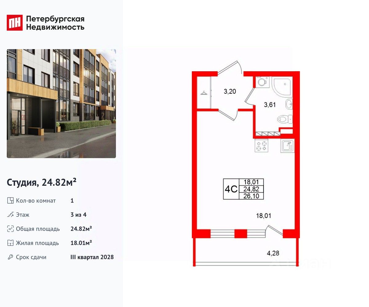 Удобная, классическая, функциональная европланировка, вместительная прихожая 3.2 м². Общая площадь студии - 24.82 м², жилая 18.01 м², высота потолка 2.77 м.