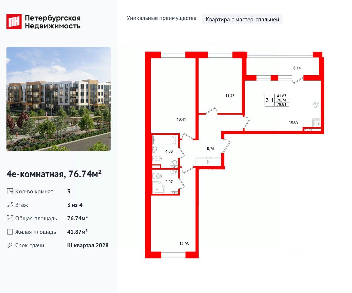 Уникальная, функциональная европланировка, большая кухня-гостиная 18.09 м², вместительная прихожая 9.75 м². Общая площадь квартиры - 76.74 м², жилая 41.87 м², высота потолка 2.77 м.