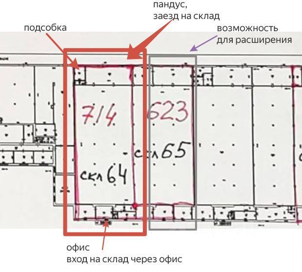 Выход из склада в офисную зону 12 подсобных помещения в каждом складе (сборка, упаковка, маркировка, хранение расходников) Инфраструктура: