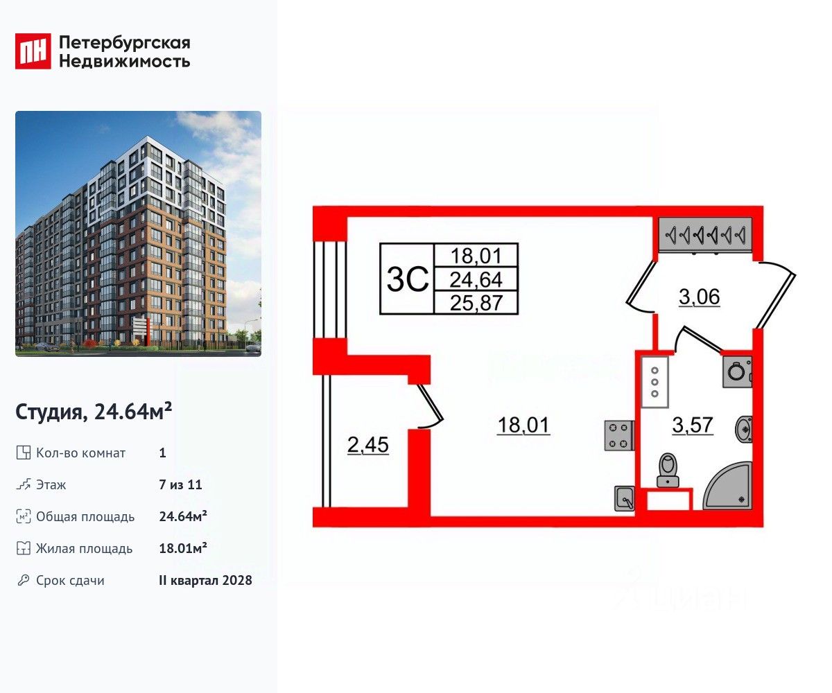Удобная, классическая, функциональная европланировка, вместительная прихожая 3.06 м². Общая площадь студии - 24.64 м², жилая 18.01 м², высота потолка 2.77 м.