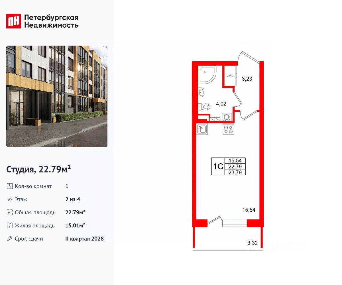 Удобная, классическая, функциональная европланировка, вместительная прихожая 3.08 м². Общая площадь студии - 22.79 м², жилая 15.01 м², высота потолка 2.77 м.