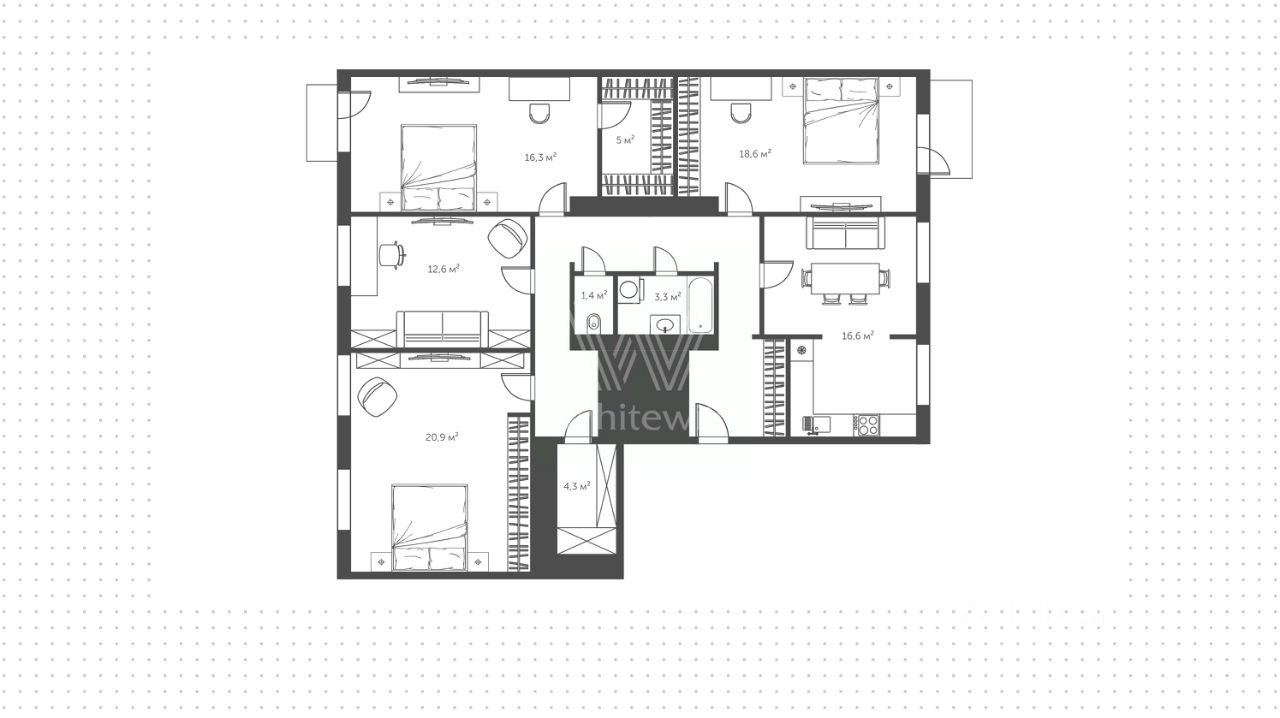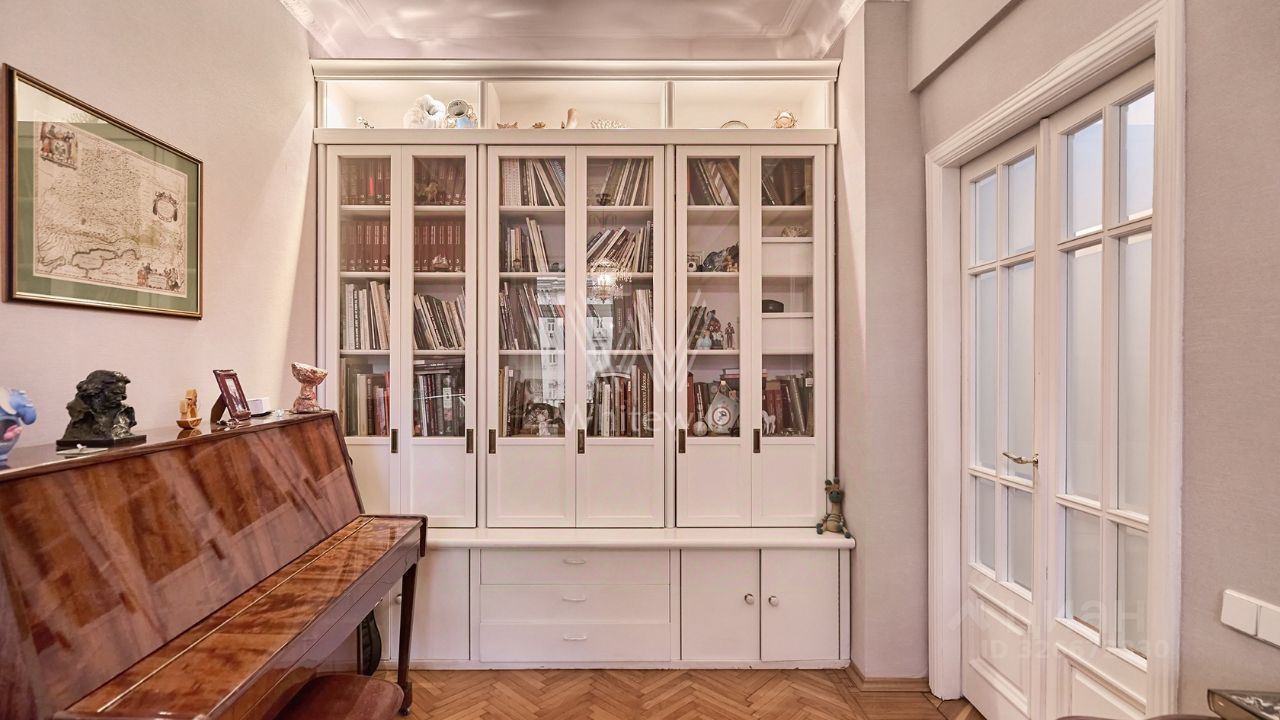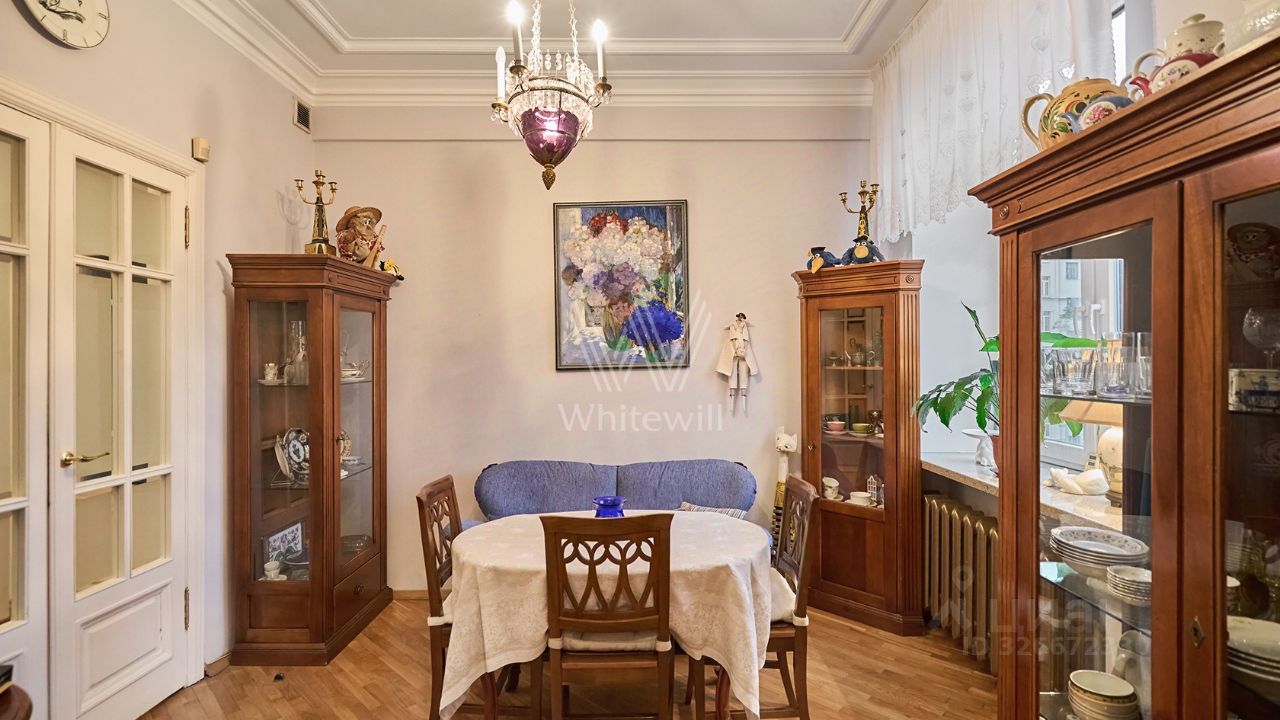 Квартира с тремя спальнями площадью 121 м² в доме ''Тверская, 8'' недалеко от Кремля. Квартира с отделкой расположена на четвёртом этаже. Функциональная планировка включает гостиную с выходом на балкон, кухню-столовую, три спальни, санузел, кладовую и холл.