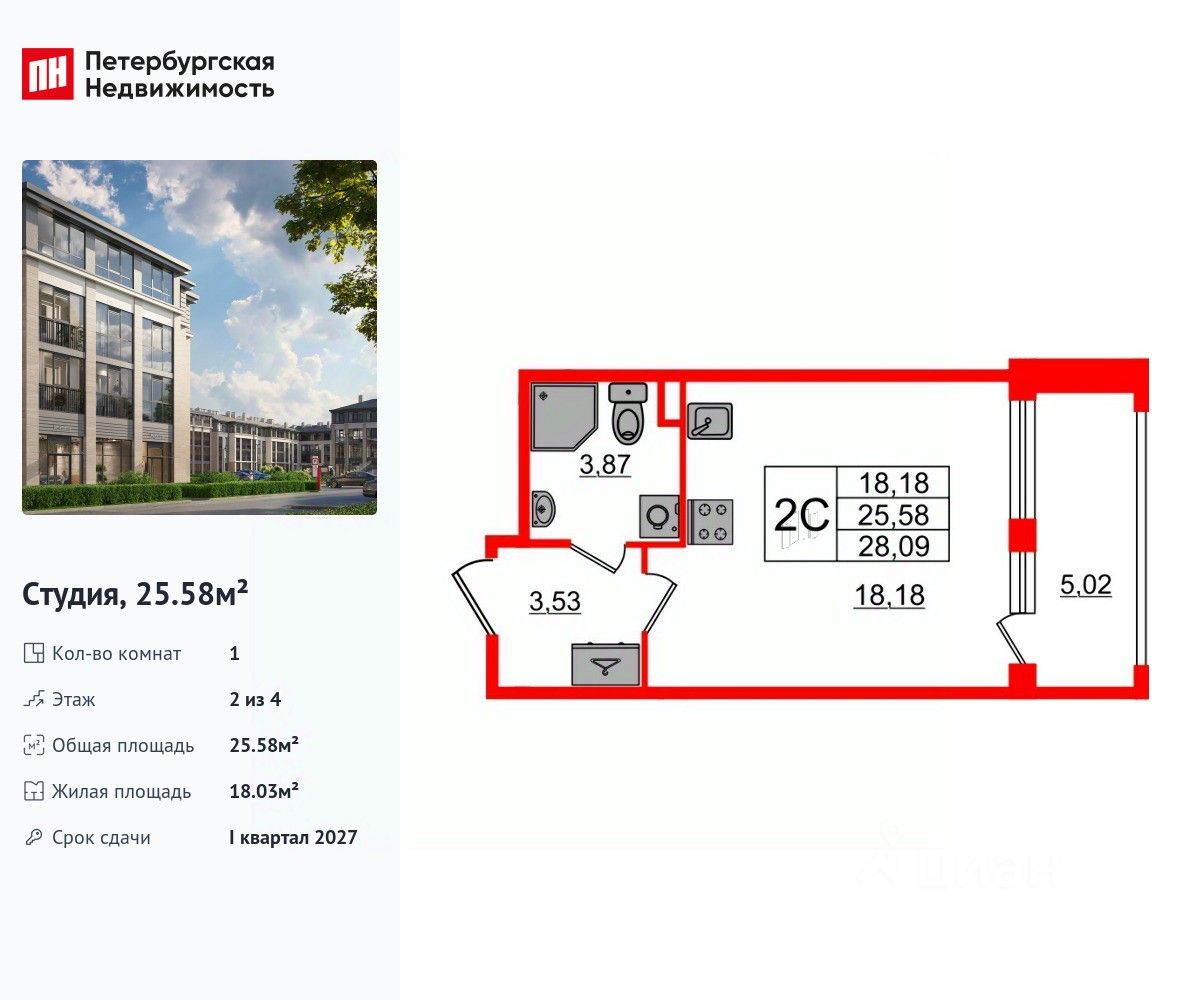 Удобная, классическая, функциональная европланировка, просторная прихожая 3.62 м². Общая площадь студии - 25.58 м², жилая 18.03 м², высота потолка 2.75 м.