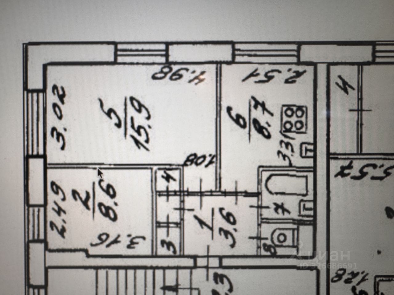 Общая площадь - 40.9 кв.м., 2 раздельные комнаты - 15.9 + 8.6, встроенные шкафы, кухня - 8.7 кв.м.. коридор - 3.6 кв.м., сан. узел раздельный. Окна квартиры выходят во двор и частично на проспект. Окна - стеклопакеты, батареи новые.
