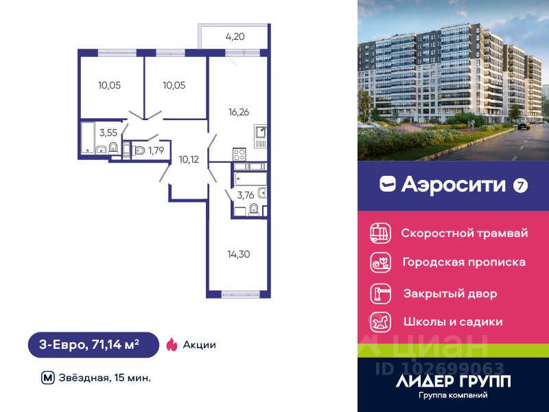 ЖК AEROCITY 7 объединил лучшие идеи и стремления создать гармоничную и безопасную жилую среду. Аэросити 7 — новый проект комфорт-класса от ГК ''Лидер Групп'' в составе развитого семейного квартала АЭРОСИТИ. Жилой комплекс располагается рядом с новым Старорусским проспектом и строящейся линией скоростного трамвая ''Славянка''. Территория ЖК примыкает к образовательному кластеру, в который входят два детских сада и две школы, одна из них с 25-метровым бассейном и большим стадионом. Еще один детский сад возводится девелопером в нескольких минутах ходьбы от нового проекта. Дом находится в уже освоенной части квартала, поэтому вся коммерческая инфраструктура работает в торговых галереях на 1-х этажах расположенных по соседству зданий