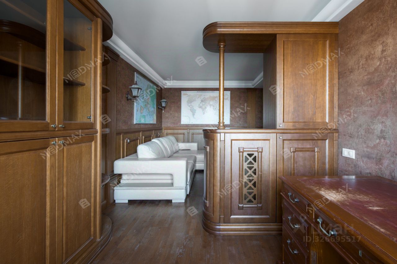 Планировка включает в себя большую гостевую зону, кухню, уютную мастер-спальню и отдельный дубовый кабинет с электрическим камином и массивным столом из ореха. В спальне новая кровать (180*200) и вместительная гардеробная, а также санузел с душевой. Также есть и гостевой санузел. На кухне из техники: большой холодильник, встроенная микроволновая печь, духовой шкаф, керамическая варочная панель, мощная вытяжка, широкая 60 см посудомоечная машина, вся техника импортная. Квартира только после косметического ремонта.