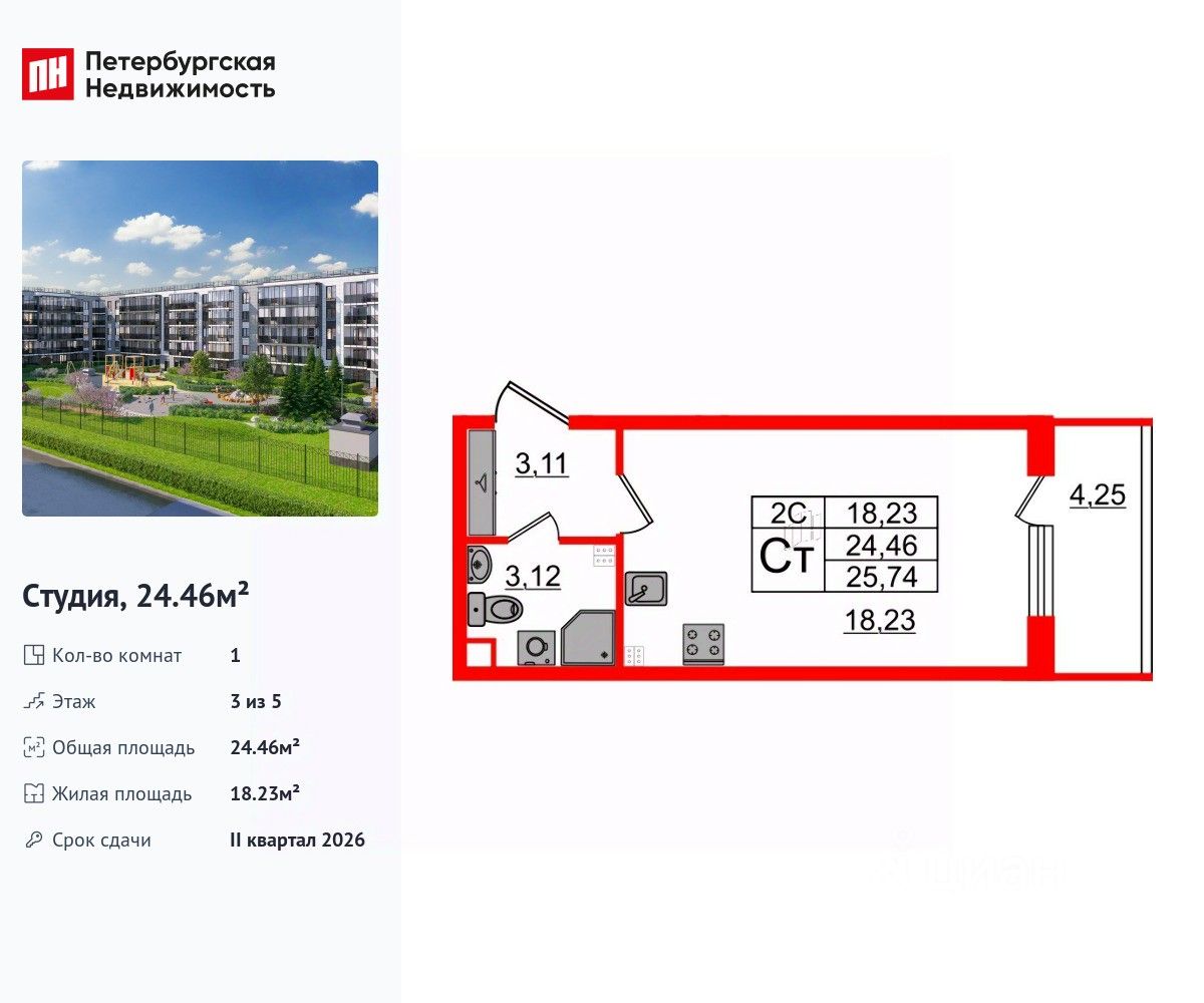 Удобная, классическая, функциональная европланировка, вместительная прихожая 3.11 м². Общая площадь студии - 24.46 м², жилая 18.23 м², высота потолка 2.77 м.