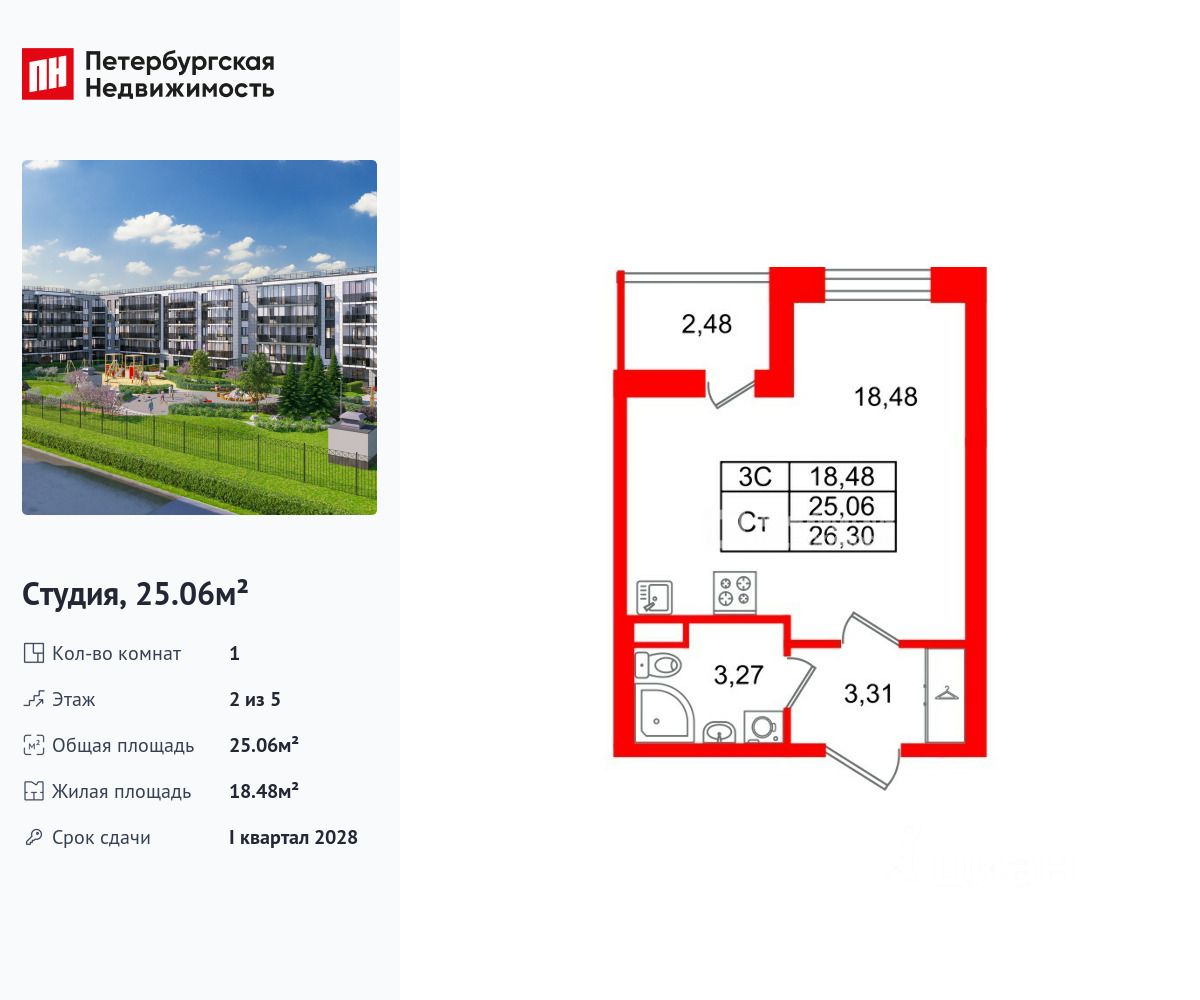 Удобная, классическая, функциональная европланировка, просторная прихожая 3.31 м². Общая площадь студии - 25.06 м², жилая 18.48 м², высота потолка 2.77 м.