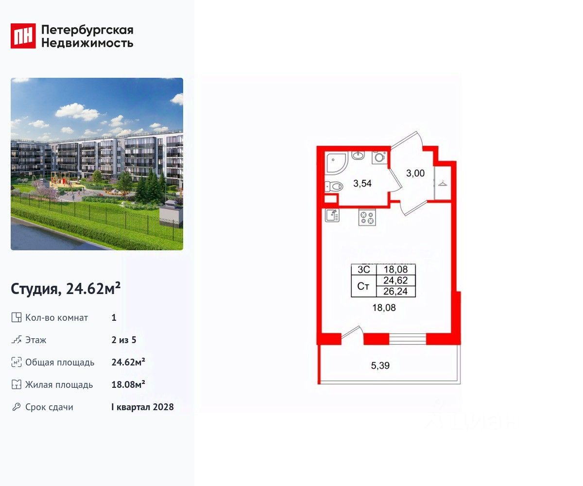 Удобная, классическая, функциональная европланировка, вместительная прихожая 3 м². Общая площадь студии - 24.62 м², жилая 18.08 м², высота потолка 2.77 м.