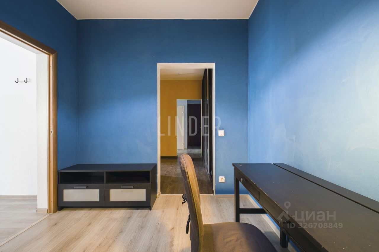 В квартире нет несущих стен, при необходимости, вы сможете изменить планировку под себя. В данный момент она предполагает просторную (24,1 кв.м.) гостиную, спальню (18,9 кв.м.) и небольшой (9,2) кабинет. В большой прихожей есть места для хранения, которую, опять же, при желании можно спланировать под отдельную гардеробную комнату.